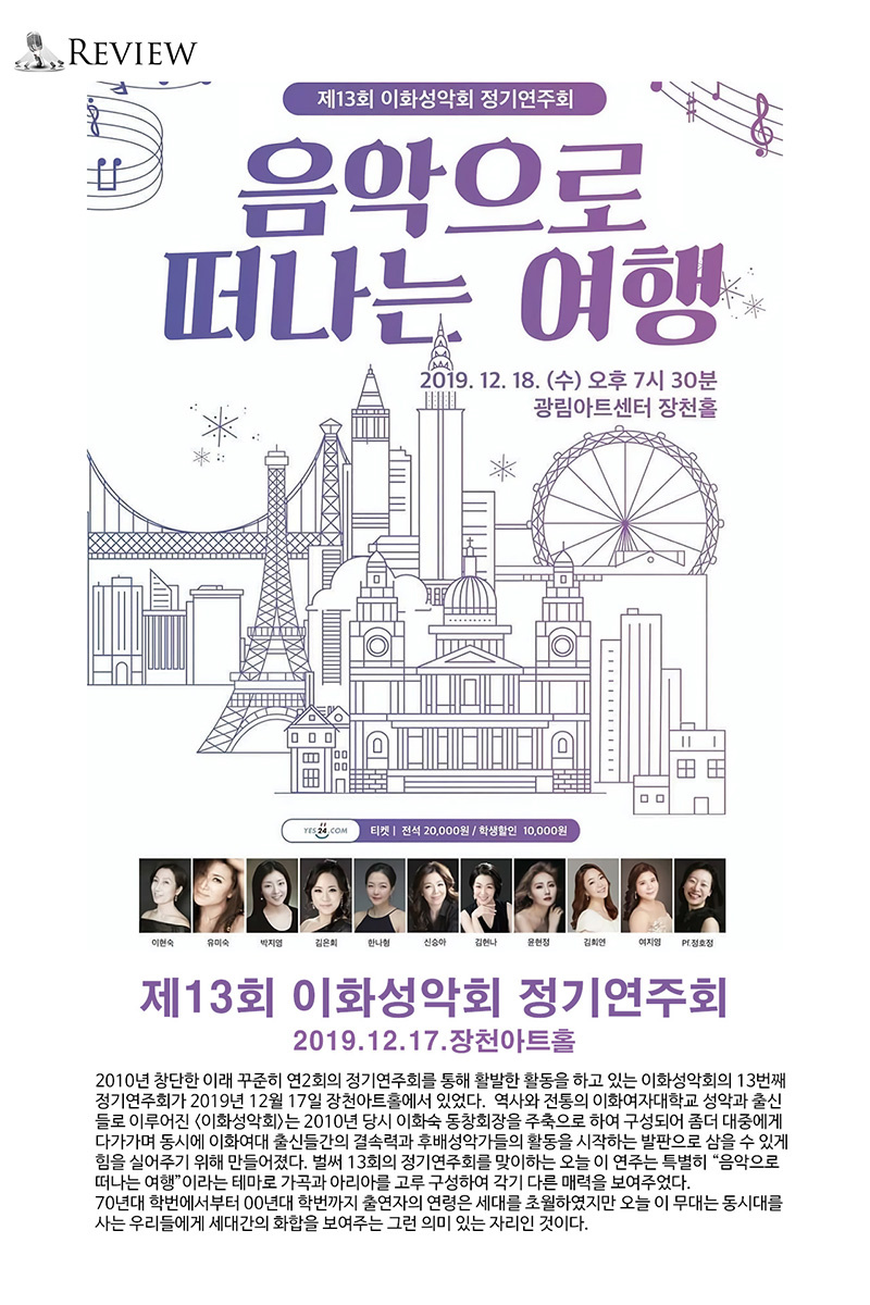 벌써 13회의 정기연주회를 맞이하는 오늘 이 연주는 특별히 “음악으로 떠나는 여행”이라는 테마로 가곡과 아리아를 고루 구성하여 각기 다른 매력을 보여주었다.