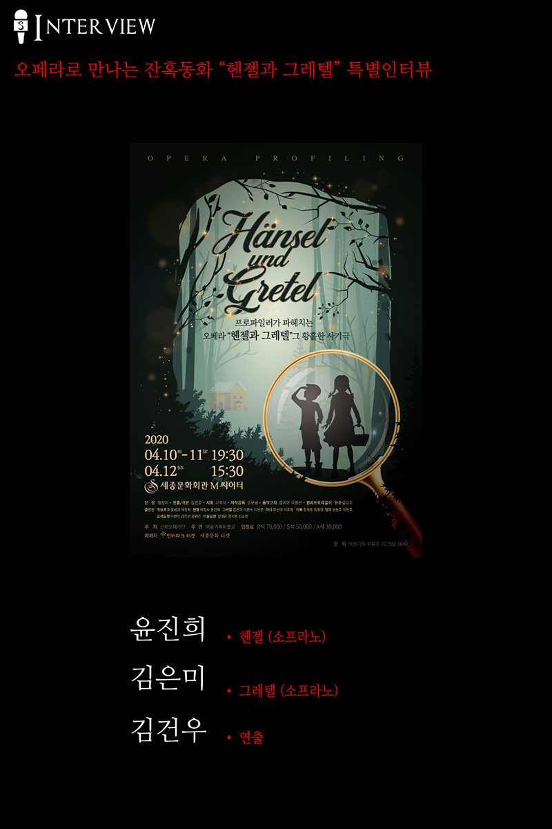 김은미 : 헨젤과 그레텔은 빈 유학시절 겨울이면 빈 폭스오퍼에서 시즌작품으로 늘 올려지는 작품입니다. 극중 과자로 변한 어린이들 역할을 빈 국립음대와 연계하여 학생들에게 무대에 서는 경험과 함께 일 할 수 있는 기회를 주곤 하는데 방학을 이용하여 항상 함께 하였습니다. 그때 본 헨젤과 그레텔의 느낌은 지극히 동화에서 보던 그 순수함 자체였으며 어떤 어려움 속에서도 형제애를 발휘하며 긍정적인 에너지를 뿜는 그런 역할이었습니다. 물론 그런 기본적인 캐릭터는 저희 공연에도 보여지겠지만 저는 특별히 이번 공연에서 조금 성숙한 정신연령의 그레텔을 표현하고 싶습니다. 조금 현대적인 그레텔이랄까…하하 요즘 아이들이 예전의 아이들보다는 보고 들은게 많아 언어적인 발달도 굉장히 빠르고 생각도 성숙해지고 있다고 생각이 듭니다. 우리가 더 이상 아이들을 그저 아무것도 모르는 천방지축 말썽쟁이라고 보기보다는 그들의 의견에 귀 기울이고 그들의 마음의 고민과 아픔을 품고 이해 해야 한다는 관점에서 이번 그레텔은 원작 그대로의 순수함을 유지하되 헨젤에게 어떨 때는 누나 같기도 한 성숙한 여성상을 갖은 역할로 표현하도록 고민해보고 있습니다.