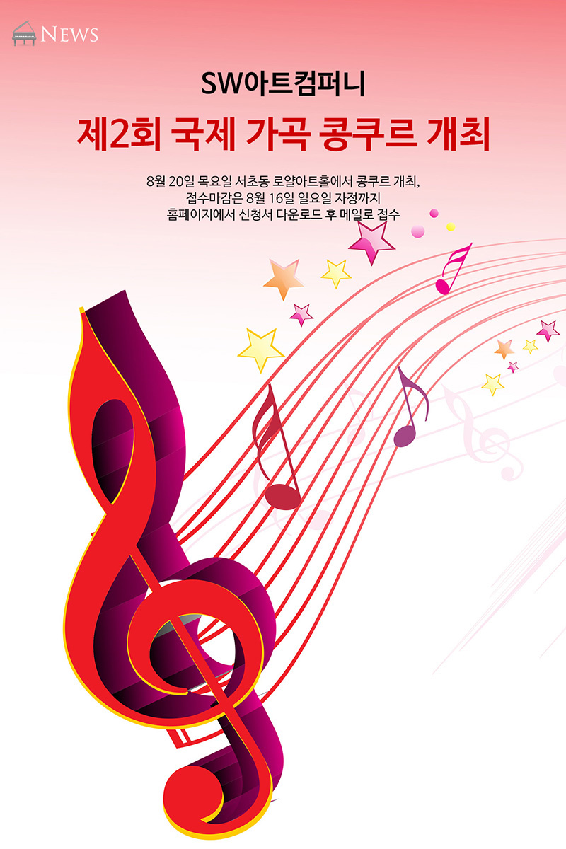SW 아트 컴퍼니(성용원 대표)가 제2회 국제가곡 콩쿠르가 8월 20일 목요일 서초동 로얄 아트홀에서 개최된다. 우리나라 가곡을 사랑하는 일반인이라면 국적, 나이 불문 참가할 수 있는 이번 콩쿠르는 자유곡 하나와 콩쿠르조직위원회에서 선정한 작곡가 6명의 주옥같은 12개의 가곡 중 하나를 택일하는 지정곡, 이렇게 두 곡을 부르는 방식으로 되어있다. 클래식 음악의 새로운 스타 발굴 및 현대적 감각의 예술성이 담긴 한국 가곡을 보급하고자 작년에 출범한 SW아트컴퍼니의 제1회 가곡콩쿠르에는 일반부 10명, 학생부 10명이 참가, 평상시라면 접해보지 못했을 생존하는 작곡가의 창작가곡을 익히고 부르면서 입상자는 카페 첼리스타에서 마련된 살롱콘서트까지 참가하는 기회를 누렸다. 1회 콩쿠르 조직위원장이었던 정치평론가 김홍국 박사는 '전체적으로 매우 수준 높고 실력이 뛰어난 전공생들의 참가로 우열을 가리기가 쉽지 않았다."라고 심사평을 밝혔다.
