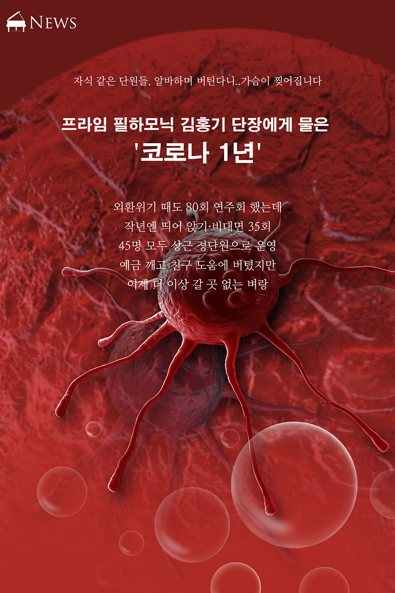 “아내의 예·적금을 깨고 친구들 도움을 받아가면서 1년을 간신히 버텼죠. 하지만 이제는 완전히 벼랑입니다. 더 이상 버티기 어려운 상황입니다.” 지난 18일 만난 프라임 필하모닉 오케스트라의 김홍기 단장은 ‘1년간 어떻게 지냈냐’는 물음에 한숨부터 내쉬었다. 창단 직후 외환위기를 맞아 오케스트라 운영이 쉽지 않았던 적이 있지만, “그래도 지금과 비교하면 천국이었다”고 했다. “1997년 창단해 그해 겨울에 외환위기를 맞았죠. 그래도 1998년에 연간 80회 가까운 연주회를 치러냈습니다. 20여년간 오케스트라를 운영해오면서 지난 1년과 같은 악몽은 처음입니다. 35회의 연주회를 겨우 진행했는데 그마저도 ‘띄어앉기’나 ‘비대면’으로 하다보니, 공연을 하면서 계속 손실을 감수하는 상황의 반복이었습니다.”