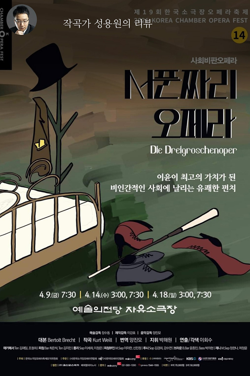 실로 4년만이다. 1999년에 시작한 이후 2017년을 마지막으로 잠시 숨고르기를 한 한국소극장오페라축제가 올 4월 6일부터 25일까지 다시 개최되면서 그 일환으로 18일 저녁 7시30분 예술의전당 자유소극장에서 쿠르트 바일의 [서푼짜리 오페라]를 관람했다.