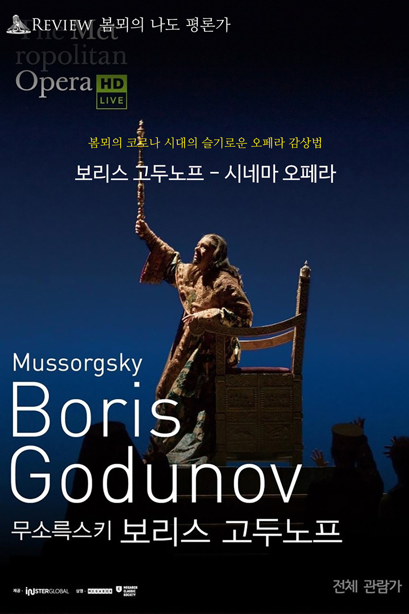 오랜만에 보는 뉴욕 메트로폴리탄 오페라단의 신작 [보리스 고두노프]가 메가박스에서 단 이틀 동안만 상영된다고 해서 급하게 예매해 보게 되었다. [보리스 고두노프]는 무소륵스키의 오페라 가운데 가장 유명한 작품이자 제대로 완성된 유일한 작품으로 나는 1989년 볼쇼이 오페라단이 내한해 세종문화회관에서 공연했던 한국 초연 작품과 지난 2017년 국립오페라단에서 공연한 작품, 이렇게 두 번을 관람했는데, 이 두 번의 공연이 우리나라에서 공연된 [보리스 고두노프]의 전부라고 알고 있다. 박종호의 [불멸의 오페라]에 의하면 이 작품은 무려 일곱 개의 버전이 있다고 하는데, 이날 관람한 메트의 공연은 1869년 무소륵스키가 작곡한 원전판으로 최초의 판본이다. 무소륵스키는 친구인 역사학자 니콜스키의 권유로 푸시킨의 극시 [보리스 고두노프]를 읽고 거기에 니콜라이 카람진의 [러시아 제국사]의 내용을 참고하여 자신이 직접 대본을 쓰고 1년 만에 오페라를 완성했다고 한다. 하지만 작품을 받아본 마린스키극장 측은 서른 살에 불과한 무소륵스키의 이 작품이 자신들의 관객들에게는 낯선 작품이 될 것이라며 여러 이유를 들어 상연을 거부하였고, 그래서 하는 수 없이 무소륵스키는 마린스키의 요청에 따라 두 번의 개정을 해야 했으며 결국 초연은 원전판이 완성된 이후 5년이 지난 1874년 제2 원전판이라 불리는 세 번째 버전으로 올려질 수 있었다고 한다. 이후 무소륵스키가 사망한 뒤 림스키-콜사코프와 쇼스타코비치 등에 의해 네 번의 개작이 더 이루어져 모두 일곱 개의 버전을 갖게 되었다고 한다. 이날 관람한 버전인 원전판은 순수하게 무소륵스키의 생각으로만 만들어진 작품으로 가장 두드러진 특징은 인터미션 없이 1막부터 4막까지를 2시간 반 동안 그대로 이어서 공연한다는 점이다. 그 때문에 메트로폴리탄 오페라 HD Live의 가장 큰 특징인 인터미션 중의 가수나 스탭 인터뷰와 백스테이지의 모습을 볼 수 없었다는 점에서는 아쉬웠다.