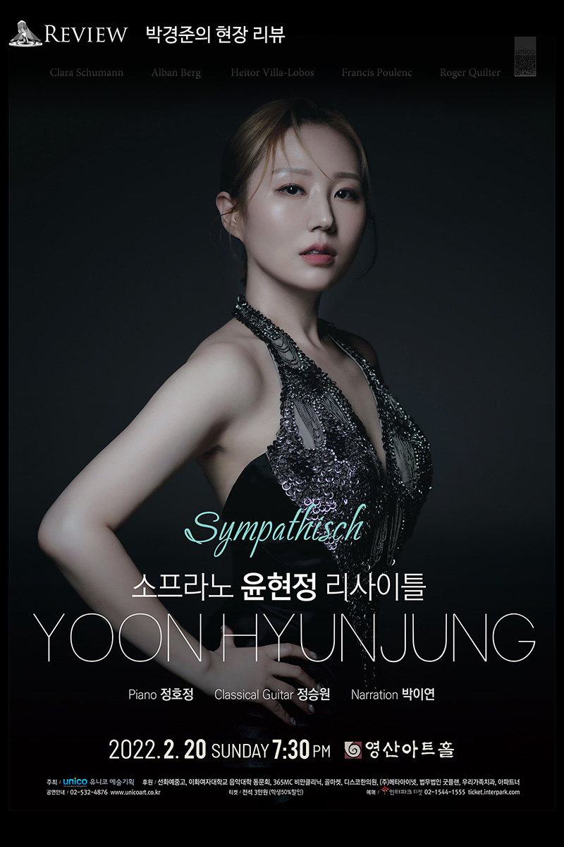 이어지는 Alban Berg의 “Sieben Frühe Lieder”는 현대로 넘어오는 독일가곡의 사족에서 친절하게 무조음악과 조성음악의 경계를 넘나들게 하는 곡인 만큼 확실히 좀더 풍성한 느낌을 주고 있다. 훨씬 느린 템포로 곡을 진행하는 성악가들도 있지만 소프라노 윤현정은 자기에게 맞는 템포로 음악을 몰입도 있게 끌고 나갔다.