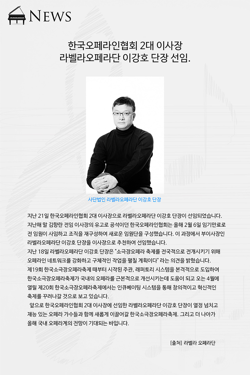 지난해 말 김향란 전임 이사장의 유고로 공석이던 한국오페라인협회는 올해 2월 6일 임기만료로 전 임원이 사임하고 조직을 재구성하여 새로운 임원단을 구성했습니다. 이 과정에서 부이사장인 라벨라오페라단 이강호 단장을 이사장으로 추천하여 선임했습니다.