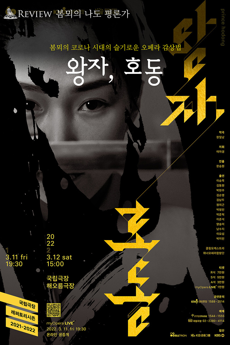 이번 주에는 원래 네 번의 공연 관람이 예정되어 있었는데, 뜻밖에 세 번의 공연이 취소되는 바람에 실제 관람하는 공연은 이 공연이 유일하게 됐다. 수요일에 보기로 했던 서울예술단의 [잃어버린 얼굴 1895]는 관람을 위해 예술의전당에까지 갔으나 급작스럽게 낮 공연 이후 휘 역의 윤태호가 몸에 이상을 느껴 실시한 신속항원검사에서 양성이 나오는 바람에 바로 PCR 검사를 하게 되어 그로 인해 내가 보기로 한 저녁 회차 공연이 취소되었고(이후 PCR 검사에서 최종 양성 판정이 나와 15일까지의 모든 회차가 취소되었다.), 목요일에 예매를 했던 앙상블 오푸스의 공연은 뒤늦은 친구들과의 약속 때문에 취소를 할 수밖에 없었으며, 토요일 극단 측으로부터 초대를 받아 관람하려던 [갈매기]도 출연 배우의 코로나 확진으로 인해 공연 일이 뒤로 미뤄지면서 공연 일정이 대폭 축소되었고 새로 잡힌 공연일에는 다른 일정으로 인해 갈 수 없게 되어 이 역시 취소가 되었다. [왕자 호동]은 티켓 오픈했을 때 예매를 했던 공연이었는데 공연에 임박해서 문화와예술에서 초대권을 준다길래 신청을 하고 그 티켓으로 가게 되었다.