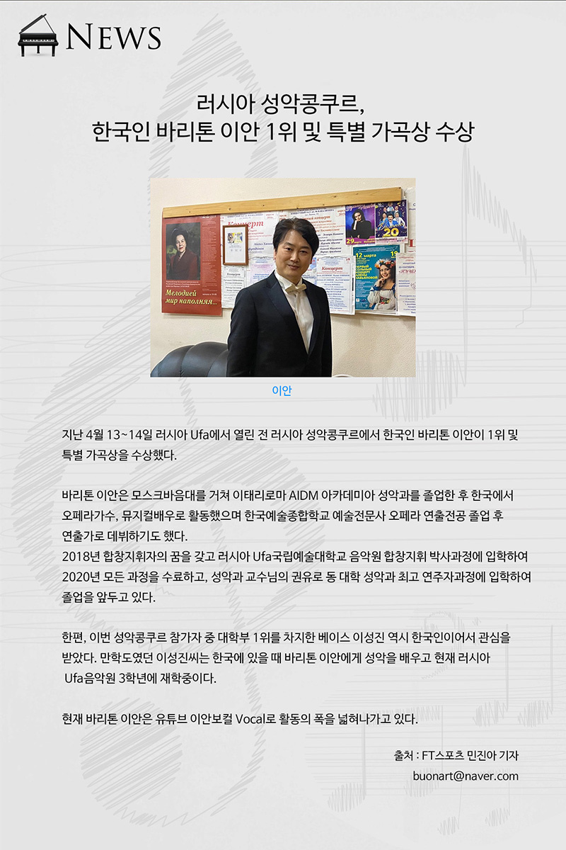 지난 4월 13~14일 러시아 Ufa에서 열린 전 러시아 성악콩쿠르에서 한국인 바리톤 이안이 1위 및 특별 가곡상을 수상했다.