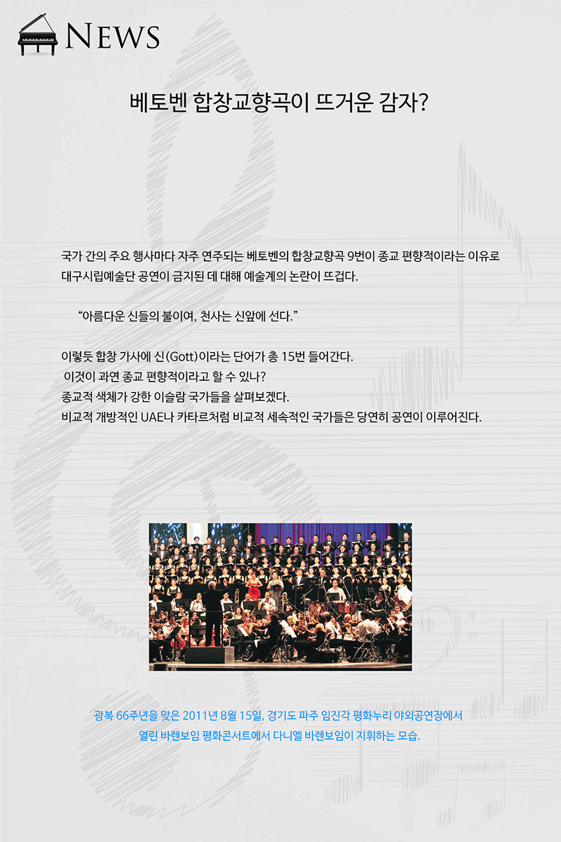 국가 간의 주요 행사마다 자주 연주되는 베토벤의 합창교향곡 9번이 종교 편향적이라는 이유로 대구시립예술단 공연이 금지된 데 대해 예술계의 논란이 뜨겁다.